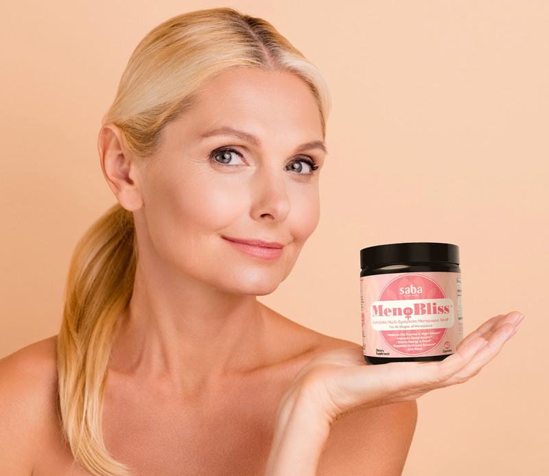 Saba MenoBliss™ is an advanced menopause supplement designed to provide comprehensive relief from menopause symptoms. It com-bines five clinically supported ingredients, including EstroG-100™, to address issues like hot flashes, mood swings, and vaginal dryness.